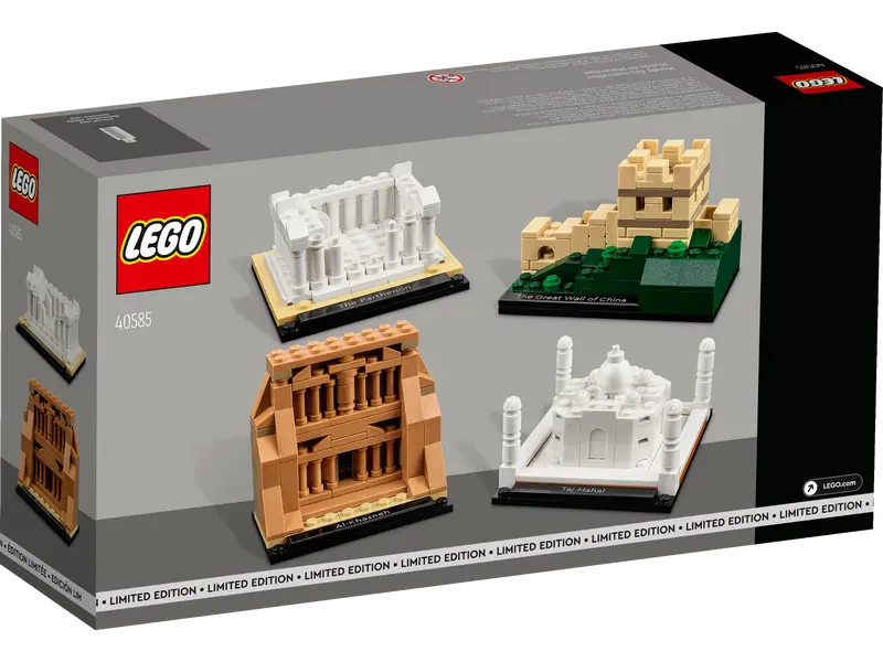 - Where does the journey take you? - Build LEGO® versions of the Taj Mahal, the Great Wall of China, the Parthenon and Al Khazneh in Petra, each with its own nameplate